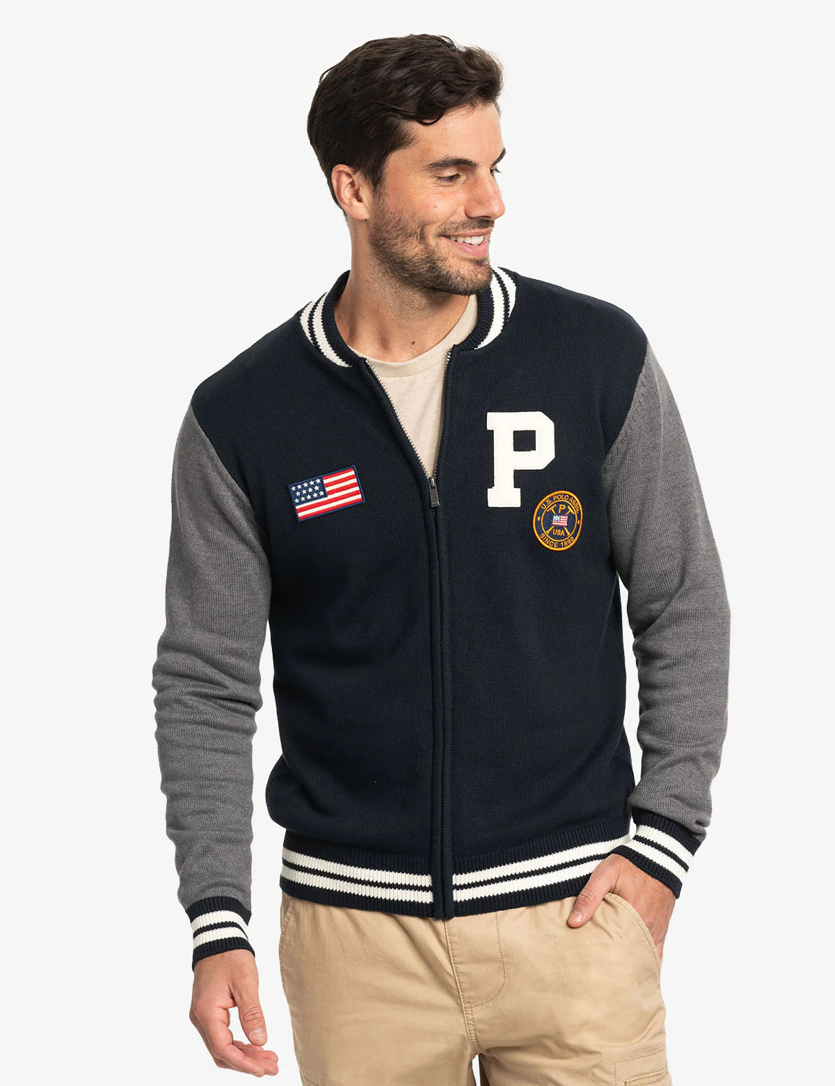 Elle se distingue par un col, des poignets et un ourlet côtelés contrastés avec des rayures rouges et blanches, apportant une touche dynamique. La fermeture zippée sur toute la longueur permet un porté facile et modulable. Sur la poitrine, on retrouve un écusson drapeau américain ainsi que le logo U.S. Polo Assn. brodé, signatures emblématiques de la marque.